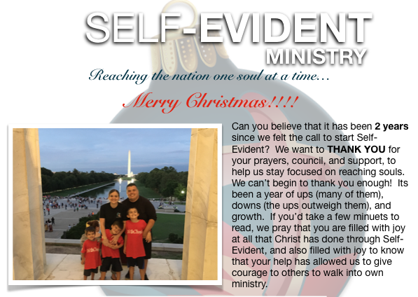 Can you believe that it has been 2 years since we felt the call to start Self-Evident? We want to THANK YOU for your prayers, council, and support, to help us stay focused on reaching souls. We can’t begin to thank you enough! Its been a year of ups (many of them), downs (the ups outweigh them), and growth. If you’d take a few minuets to read, we pray that you are filled with joy at all that Christ has done through Self-Evident, and also filled with joy to know that your help has allowed us to give courage to others to walk into own ministry. Click on the link below to continue reading or click on the video below to view the newsletter. 2017 Year End Newsletter - Happy Thanksgiving Greeting from the Campos Circus!